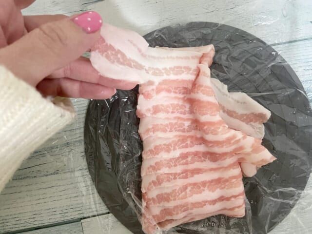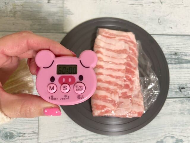 プレートを使った豚バラ肉は、見た目からも完全に解凍されているのがわかります。実際に手に取ってみても凍っている部分があるようには感じません。