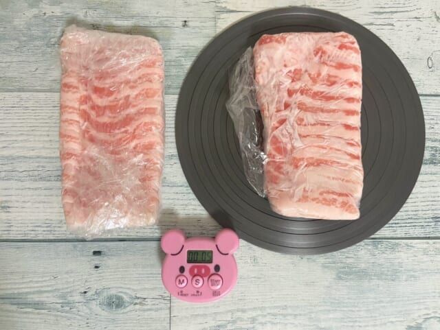 便利な解凍プレートですが、本当に効果はあるのか気になりますよね。そこで、プレートを使った豚バラ肉とプレートを使わなかった豚バラ肉の自然解凍の様子を比較してみました。