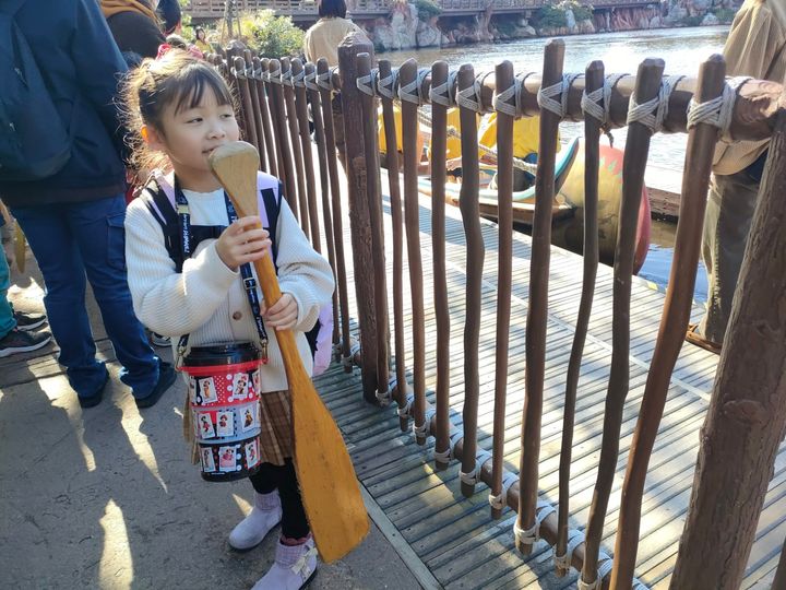 この中でも私が個人的にオススメしたいのが「カヌー探検」です!写真のようにパドルを持って本物のカヌーをみんなで漕いでアメリカ河を探検します!ディズニーランド内で唯一のゲストの人力アトラクションかもしれませんね。