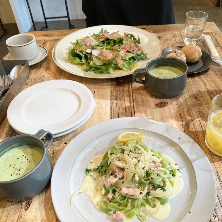 ほうれん草のパスタは、ほんのり酸味があり、玉ねぎの甘さとマッチして美味しい!ボリューム満点で食べ応えがありました!