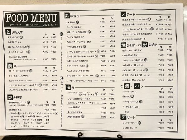 「鉄」テッパン!マークは人気のおすすめ料理、「旬」今が旬!マークは旬の食材を使った、期間限定のメニューです。全メニューに「S」スモールサイズ(2、3人分)、「R」レギュラーサイズ(3、4人分)があります。仕入れに応じた料理を提供されるのでメニューのマイナーチェンジをよくするそうです。
