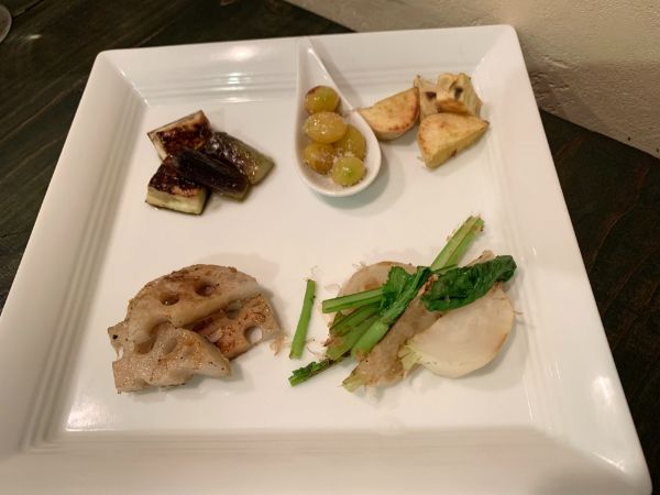 シェフは鉄板焼きらしさが出るメニューとして焼き野菜の盛り合わせ(980円・Rサイズ)がおすすめだそう。こちらは、スモールサイズが3種類、レギュラーサイズが5種類で提供されます。来店時は蓮根・小かぶ・なす・ぎんなん・安納芋でした。どの野菜も鉄板で焼いているからかおいしさ倍増で特にぎんなんは塩気が効いておいしく、小かぶはホクホクでもっと食べたいぐらいでした。