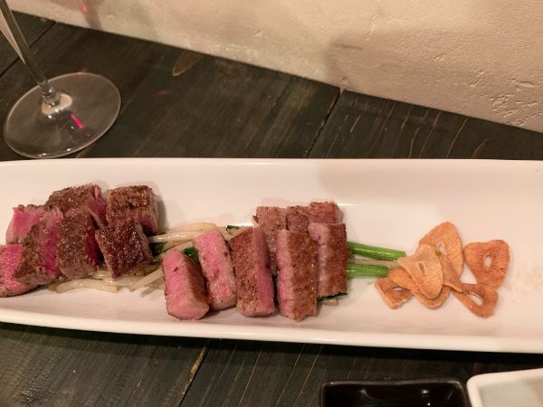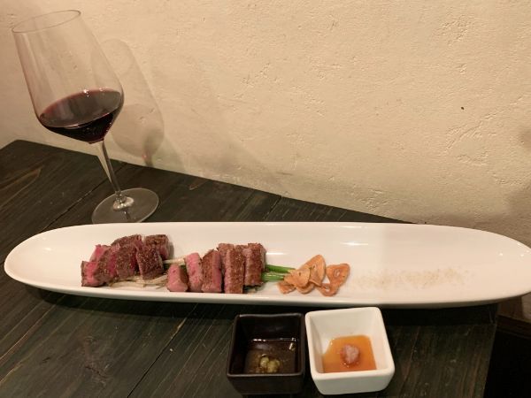 シェフが腕によりをかけ、丁寧に焼き上げられたお肉たち。サーロイン(真ん中)は食べると少し噛むと表面がカリッとしつつほんの一瞬で溶けるのに対して、上位等級肉使用のフィレ(左)はより歯ごたえがありつつ肉肉しい印象。どちらも繊細で柔らかな口当たりでありながらうまみを感じる本格的な味わいでもう最高~!赤ワインが恐ろしく進みます。ちなみにフィレとサーロインだとフィレを注文される方が多いそう。サーロインと比べると脂も少なめでさっぱりしているからでしょうか。