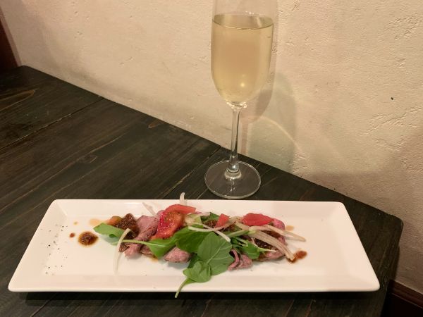 前菜はローストビーフのサラダ(680円・Sサイズ)がやってきました。鉄板で作ったローストビーフと食べるサラダのおいしいこと!柑橘系のドレッシングがさっぱりした印象になり、スパークリングワインのシャルドネと相性ばっちり。