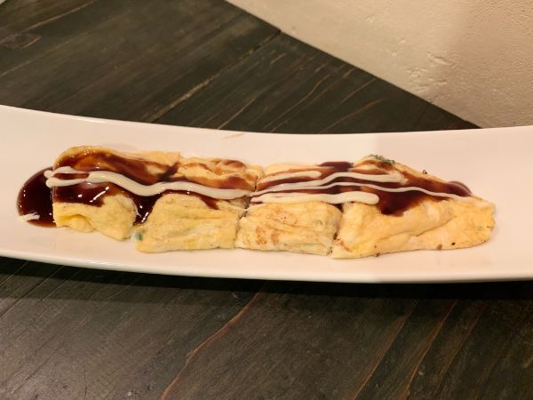 前菜を食べ終わると、チーズとん平焼き(480円・Sサイズ)がやって来ました。とん平焼きはシェフが鉄板焼き料理を学んだ原点メニューの一つらしく思い入れがあるそう。一口食べると、生クリーム&バターのクリーミーな風味と中のチーズとしそが相まってとろとろ・ふわふわ~。大阪らしいとん平焼きがフレンチかのごとくすっかりオシャレメニューに変身しています。