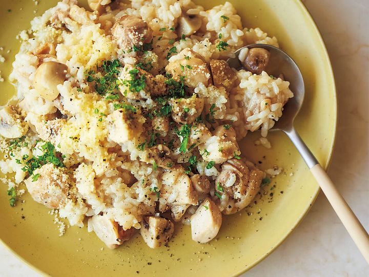 にこまおさんイチオシのワンパンで作る簡単リゾットレシピ♡【鶏とマッシュルームのお手軽リゾット】