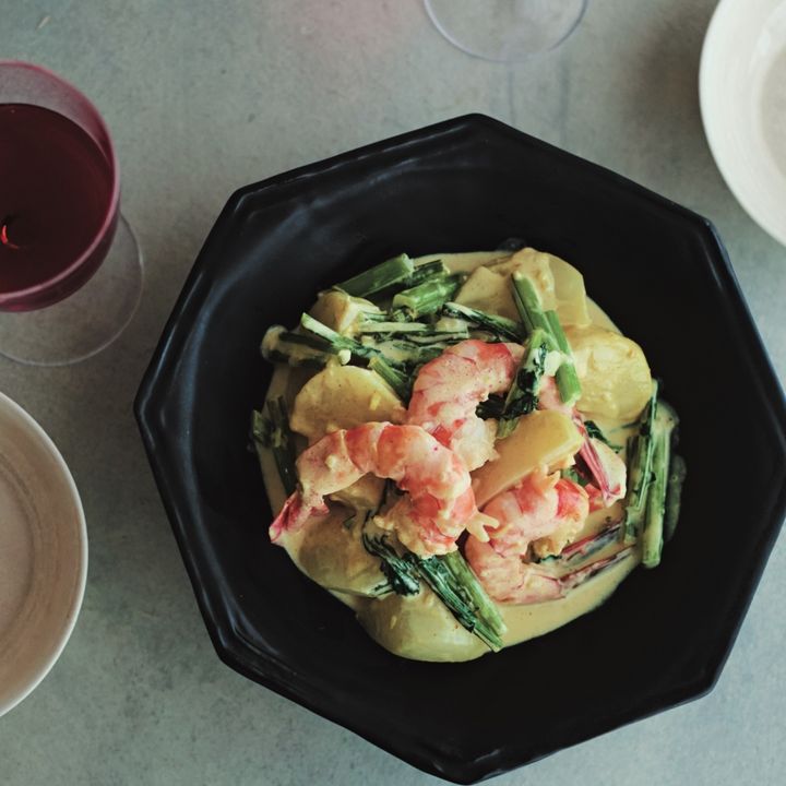 カレー粉の風味をほんのりきかせ、お酒の味も楽しめるクリーム煮に。えびのプリッとした食感と、かぶのジューシーな甘さが食欲をそそる。