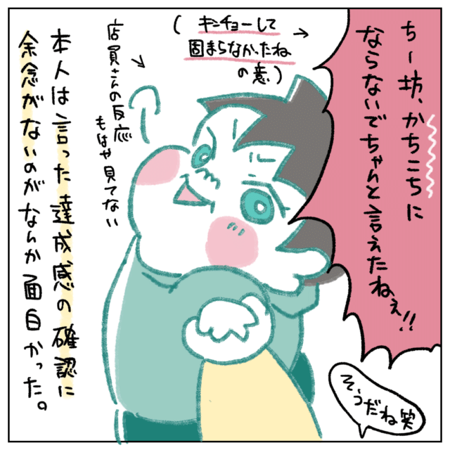 もはや店員さんの反応は見ていなくて、ちゃんと言えた達成感の確認に余念がない息子くんの姿が面白くて