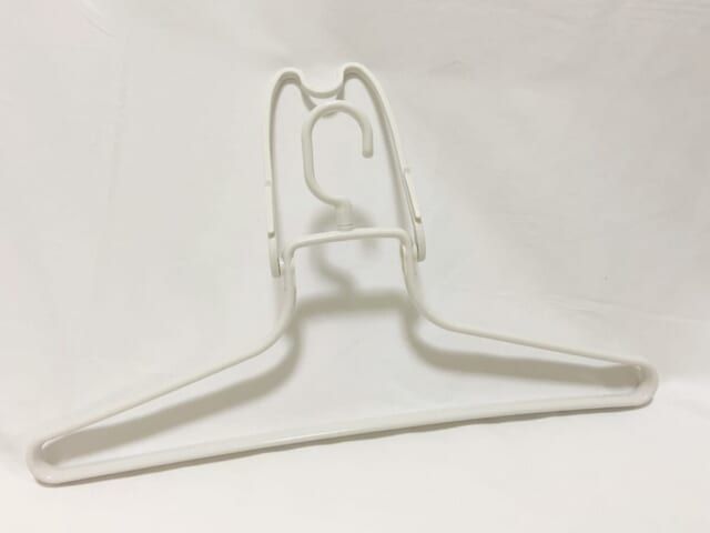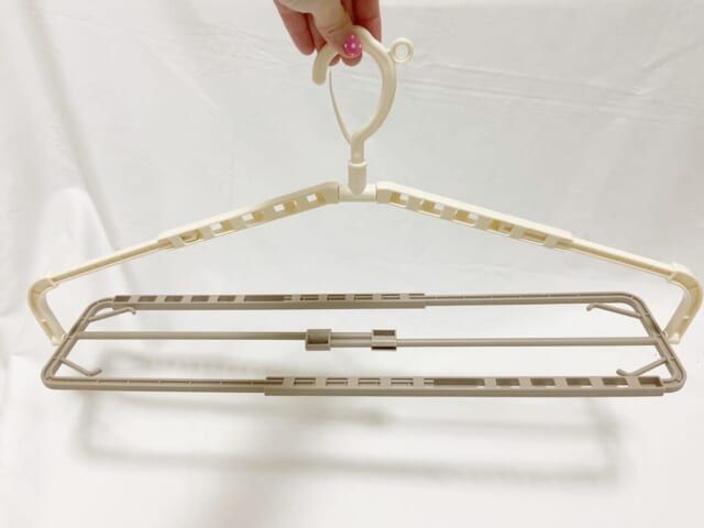 「伸縮ハンガー」は、アームの幅が幅43cmから幅65.5cmまで伸縮するハンガー。2024年3月にリニューアル発売し、現在店頭で購入できるカラーはアイボリーに変わっています。