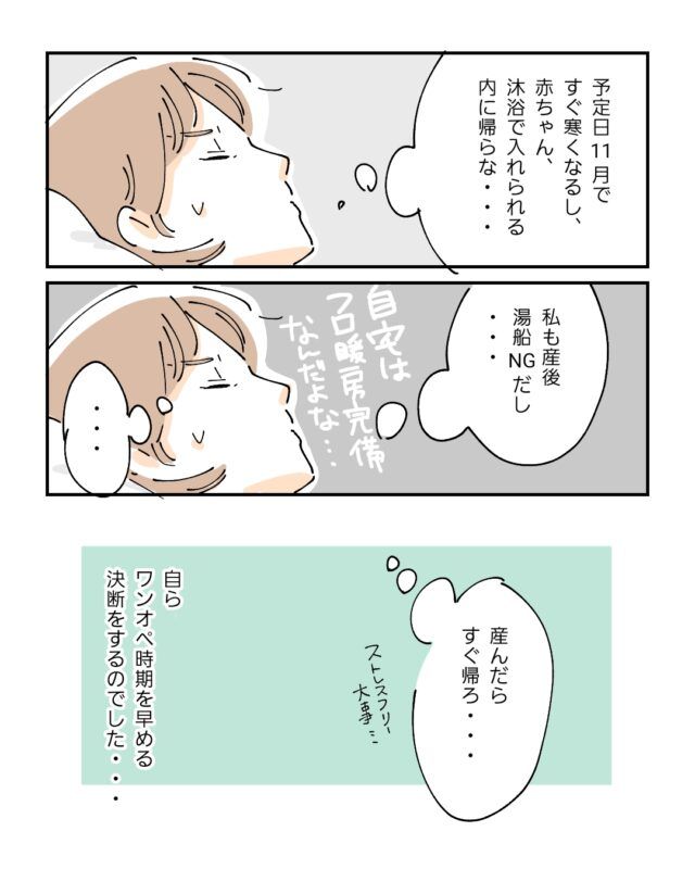 (予定日11月ですぐ寒くなるし、赤ちゃん沐浴でいれられるうちに帰らなきゃ・・。私も産後湯舟NGだし・・)