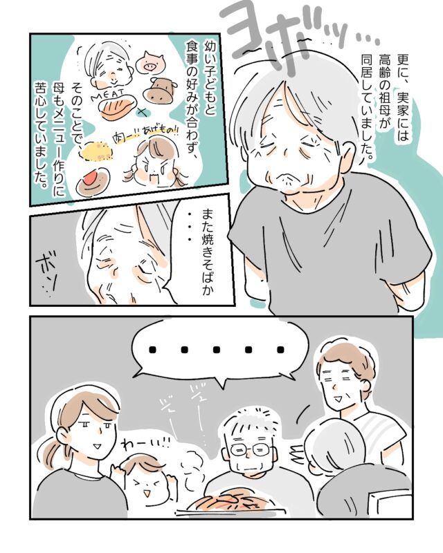 更に、実家には高齢の祖母が同居していたこともあり、幼い子どもと食事の好みが合わず、そのことでお母さんもメニュー作りに苦心していたようで・・