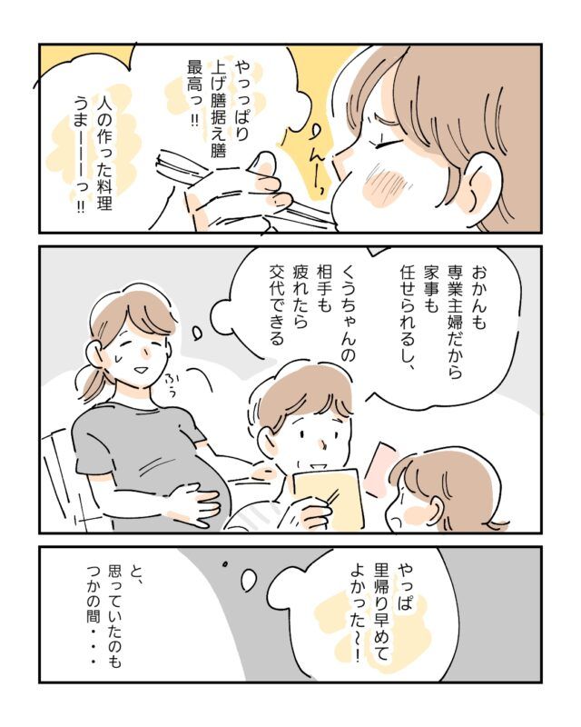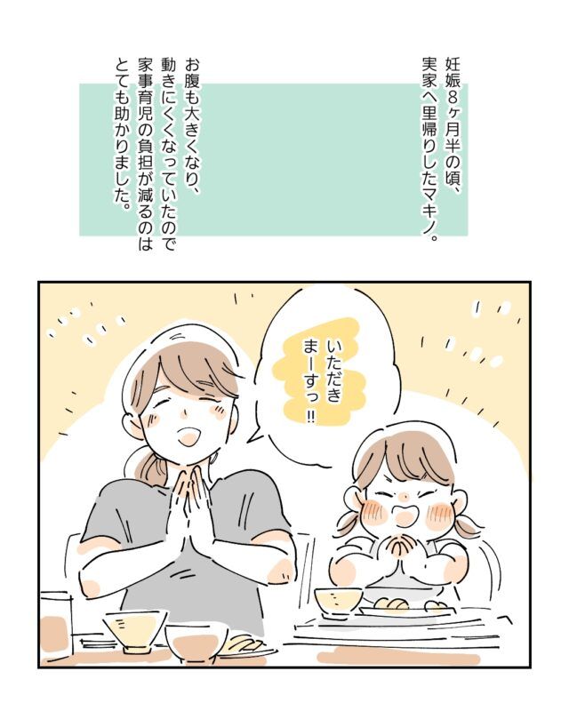 妊娠8ヶ月半の頃、実家に里帰りしたマキノさん、お腹も大きくなり、動きにくくなっていたこともあり、家事育児の負担が減るのはとっても助かったのでした。