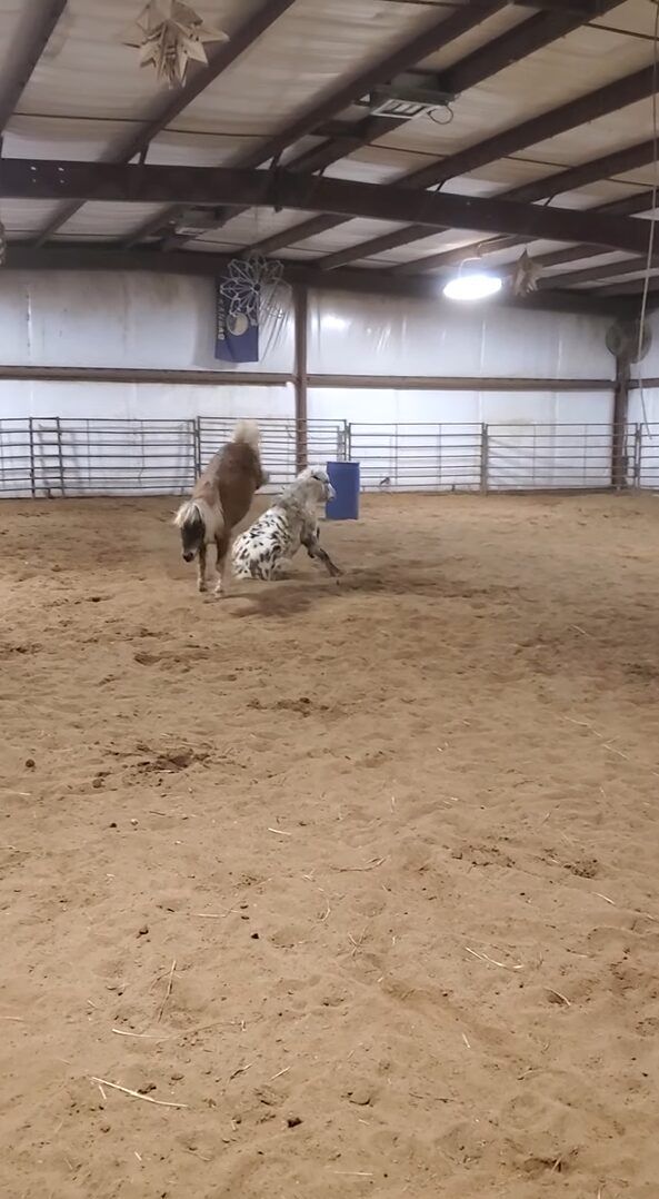 2頭のポニーのうち、栗毛の方の子がぶち毛の方の子に激しいバックキックを繰り出している様子が!!