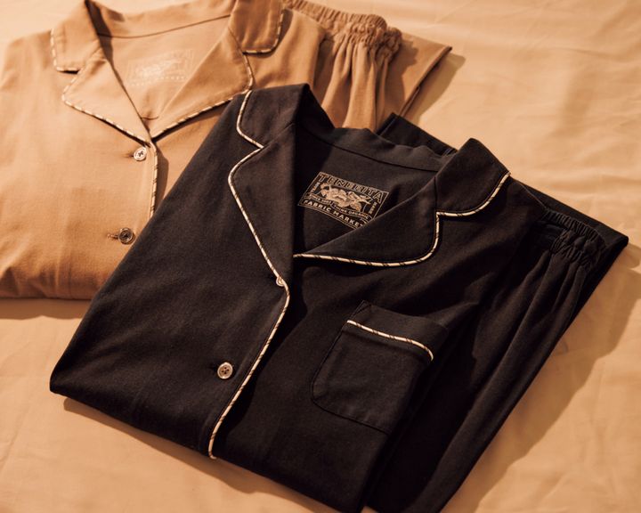 オーガニックコットン100%の素材を使用し、肌に触れると安らぐ着心地とリピーターが多いパジャマ。80/2プレーンジャージレディースパジャマ 各¥25,300(テネリータ/インコントロ)