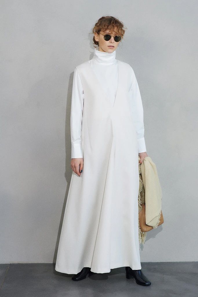 ドレスのようにダイナミックに広がるシルエットのオールインワンにハイネックのブラウスを仕込み、ゆったりしているのにきちんと見える仕上がりに。ALL白+幅広フォルムの膨張感をそぎ落とす切れ味の鋭いVネックデザイン。ニュアンシーなサテンの白と混じりけのないブラウスの白とで、1色の中でも濃淡をつけると奥行きのあるワントーンへレベルアップ。