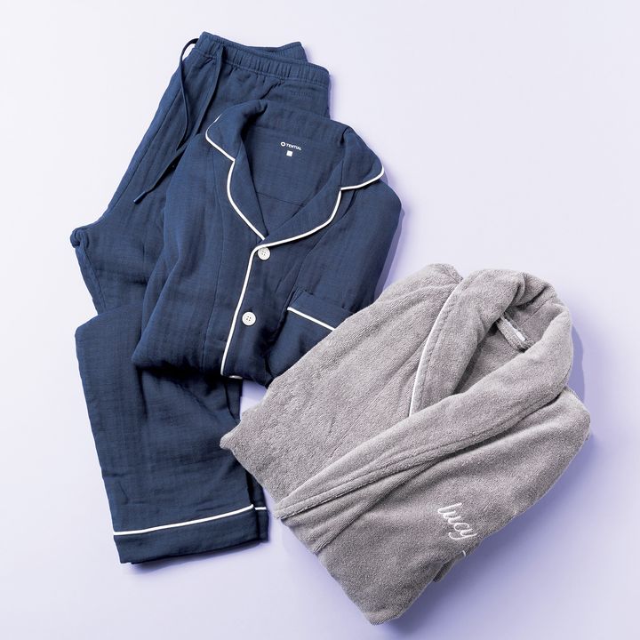 4 層構造のガーゼで肌面は綿素材。BAKUNE Pajamas Gauze 上下セット(長袖・ロングパンツ)¥26,400(TENTIAL)