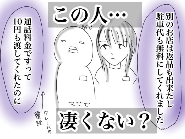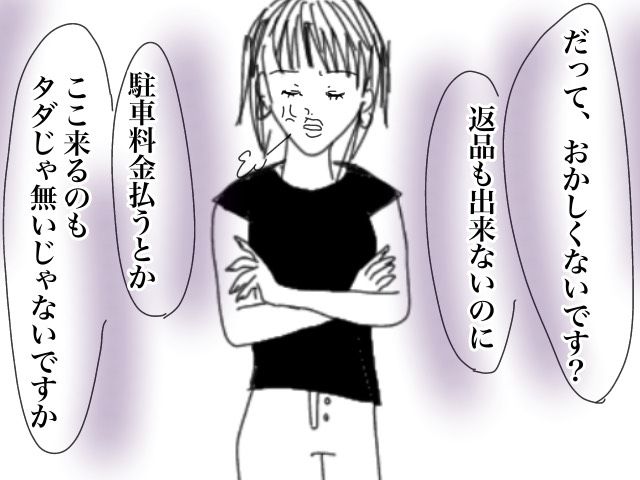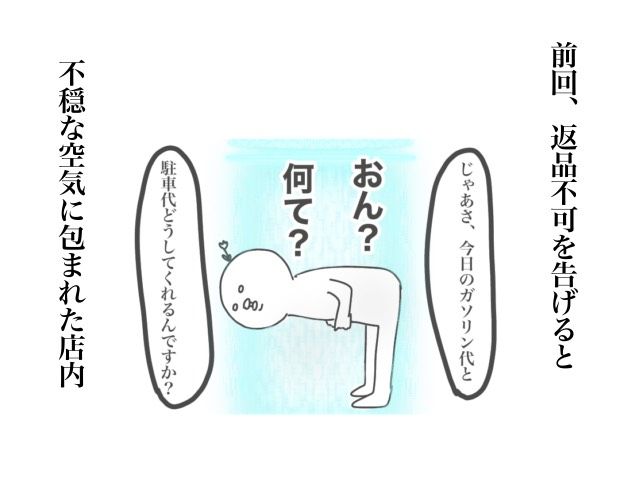 不良品でないと返品できないと知ると「シワがすごくて・・」と証言を何度も変えて返品を要求するクレーマー・・。きっちりと正論で丁寧にお詫びしながら説明するアツアゲさんのお辞儀の角度は90度!すると・・「じゃあ今日のガソリン代と駐車場代はどうしてくれるんですか?」と聞かれ「おん?何て?」と頭の中が?でいっぱいに・・