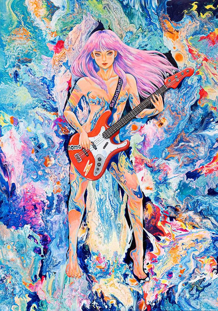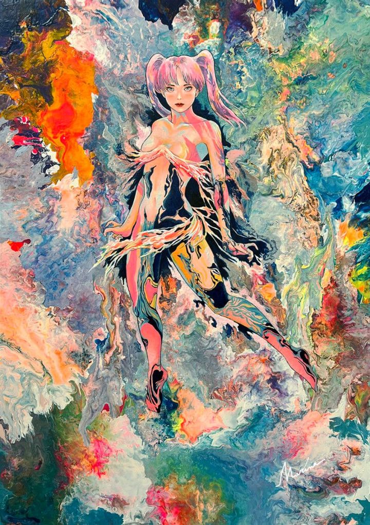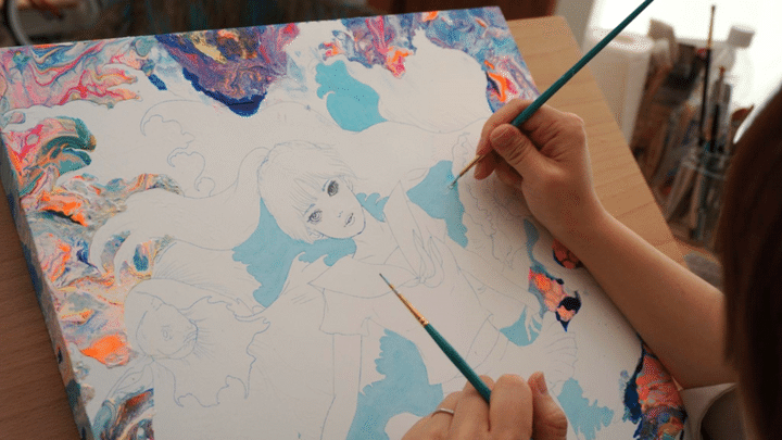 ポーリングメディウム(アクリル絵の具を混ざらないように加工して垂らす手法)で作った背景の上から描く。写真は女性の周りの背景色を塗っている様子。
