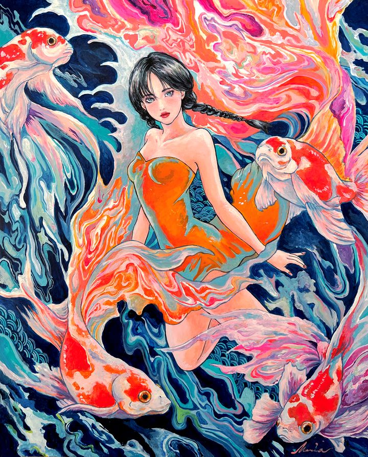 『MIND』 女性を守るようにアロワナや雲が描かれている