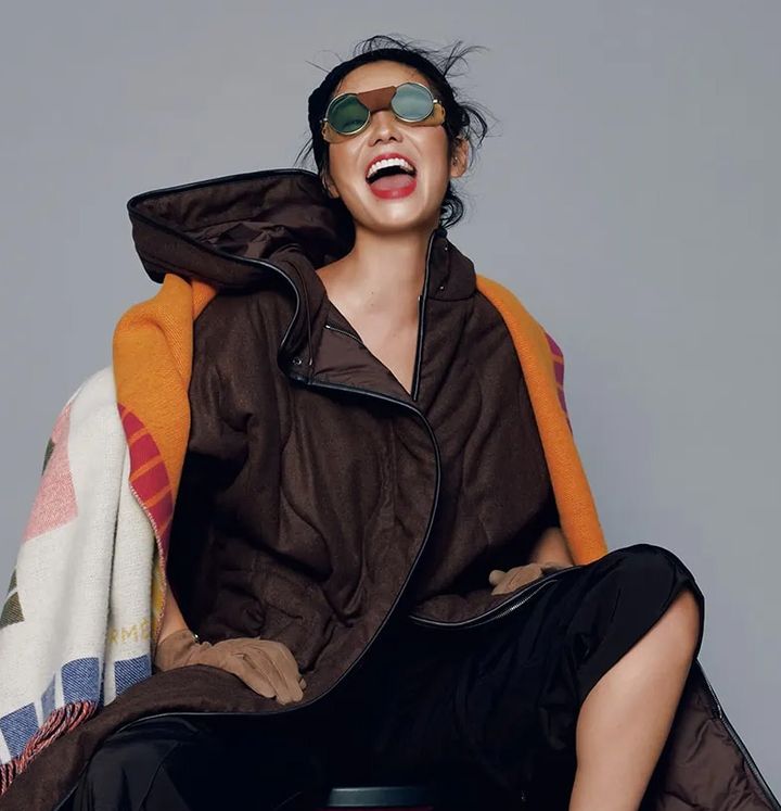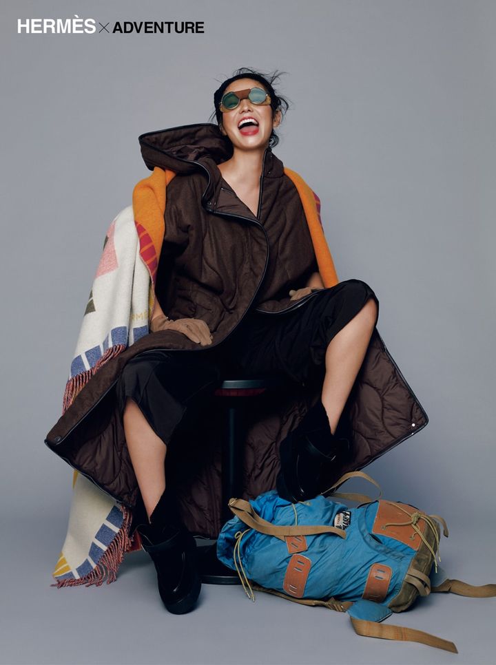 「アフリカへ冒険に出かける女性をイメージしました。実際に寝袋になるコートや使い込んだようなヴィンテージのバックパック、パイロットが掛けていそうなサングラスなど、一見ワイルドな感じにみえるけれど、生地の光沢感や、まるで素肌に羽織っているかのような肌見せの塩梅が都会の片鱗を感じさせます」