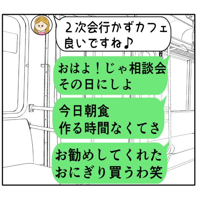 「次の相談会はいつですか?」ふり子さんに聞かれ、「そうだ!もうすぐ飲み会がある!」とテンションが上がる良し男さん、ふり子さんとのやり取りは、ただの息抜きで家族を裏切ることはない、と言いつつ、ふり子さんからの連絡は通知オフ、スマホのパスワードも変更すると用意周到な・・
