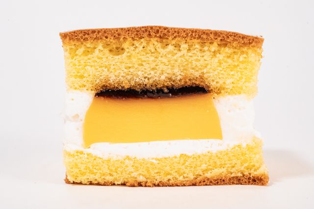 ふわっとくちどけのよい生地に、北海道製造生クリームをブレンドしたホイップクリームと固めのプリンをサンド。