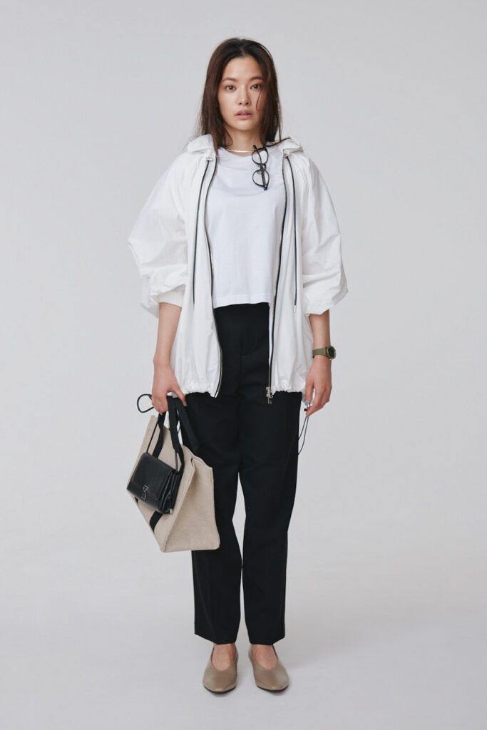 パンツ¥3,990(UNIQLO)ブルゾン¥63,800(チノ/モールド)カットソー¥11,000(ニコラ ジェンソン/リノウン)チョーカー¥24,200(イン ムード/フォーティーン ショールーム)眼鏡¥38,500(プロポ/プロポデザイン)時計¥14,300(アイスウォッチ/ビヨンクール)ウォレットバッグ¥46,200(イアクッチ/イアクッチ 大丸東京店)トートバッグ¥31,900(フランソワ レニエ/ヤマニ)フラットシューズ¥22,000(ユナイテッドアローズ/ユナイテッドアローズ 渋谷スクランブルスクエア店)