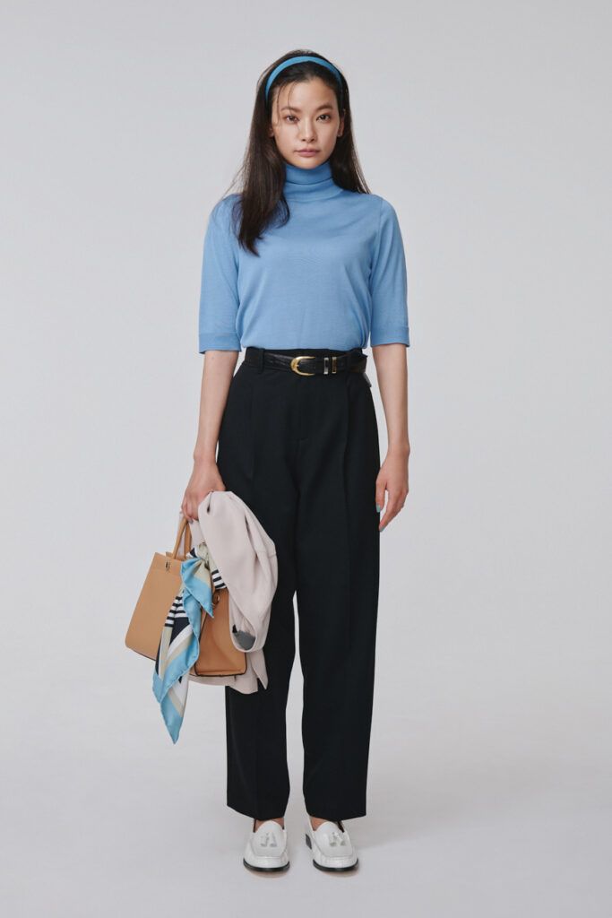 パンツ¥3,990(UNIQLO)ニット¥19,800(デミルクス ビームス/ビームス公式オンラインショップ)ベルト¥19,800(チノ/モールド)ジャケット¥23,980※5月展開(アンクレイヴ スタンダード/アンクレイヴ)バッグ¥6,490(シップス エニィ/シップス インフォメーションセンター)スカーフ¥22,000(GMSC/DES PRÉS)ローファー¥29,700(ダイアナ/ダイアナ 銀座本店)カシューシャ/私物