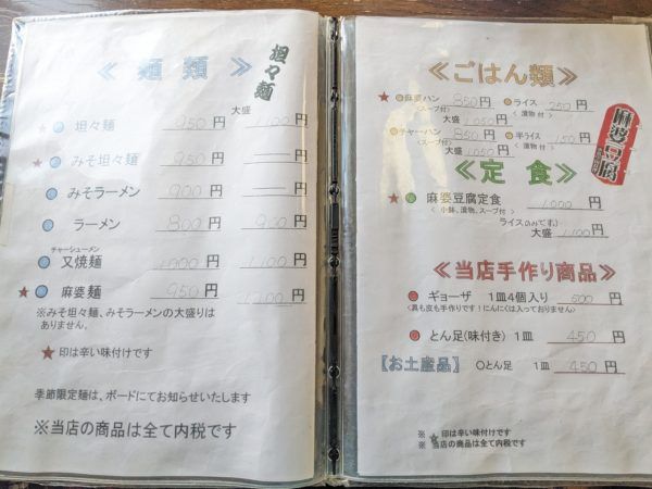 メニューはこちら。 麺類やごはん類、ギョーザ、とん足も! 周りを見ると、やはり担々麺や麻婆豆腐定食をいただいている方が多いですね。 この日は頼みませんでしたが、「福来苑」のギョーザは大きくて食べごたえもあり、おすすめです。