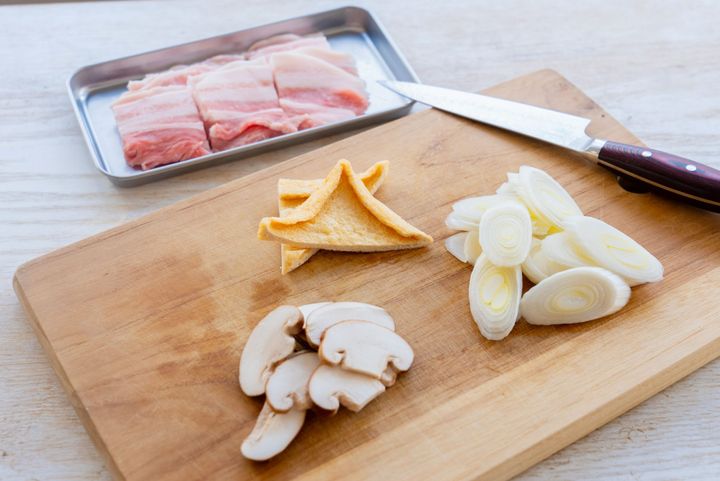 ①豚バラは4cm幅に切る。長ネギは斜め薄切りにする。しいたけは石づきを取り、薄切りにする。油揚げは斜め半分に切る。