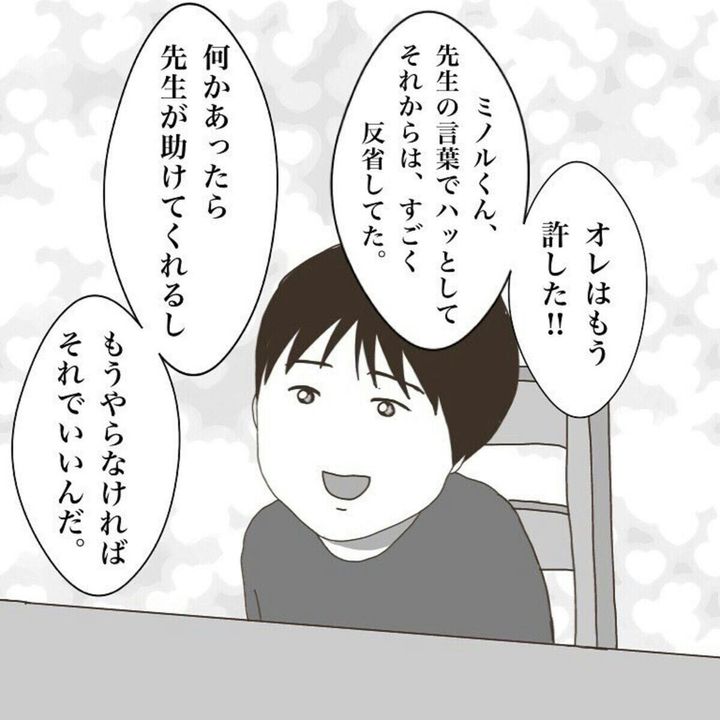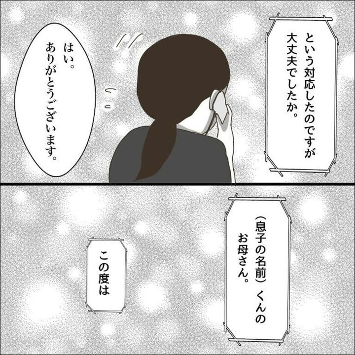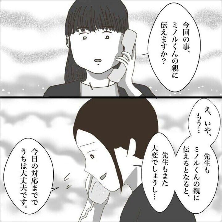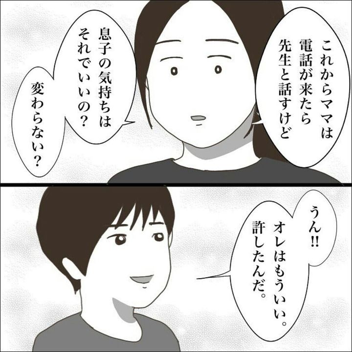 学校から笑顔で帰ってきた息子に安心する愛すべき宇宙人(@aisubekiutyu_jin)さん。息子からはミノルくんが反省していたから許したと聞きました。その後、先生からも電話でこの日の報告を受けます。そこで先生からミノルくんの親に伝えるかどうかを聞かれます。『いじりといじめ』25話をごらんください。