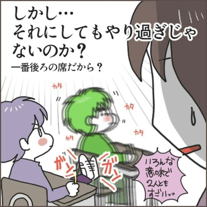 参観日で、保護者がきているのにも関わらずにキリギリスRINさんの長男君の椅子を足で揺らし続けるP君は、誰かに叱られるかどうかも気にしていなさそうなので、かなり強気ですね。反応を示さない長男君を試しているのでしょうか。