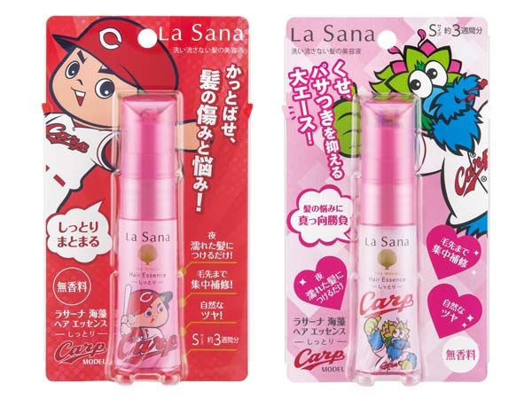 今回限定発売の「ラサーナ 海藻 ヘア エッセンス カープモデル」は、マスコットキャラクターの「カープ坊や」や「スラィリー」をあしらった、愛嬌たっぷりな2種のデザイン。野球にちなんだユニークなキャッチコピーにも注目です。