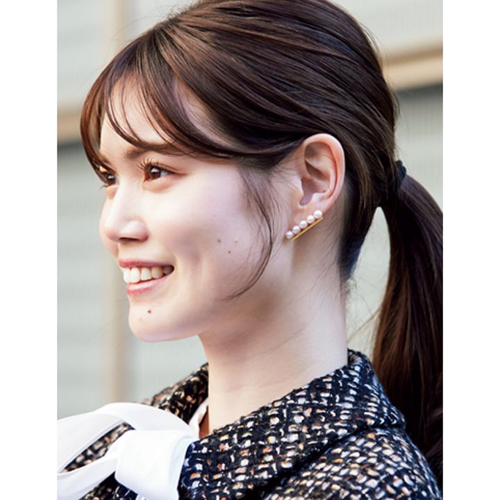 カーディガン¥28,600 スカート¥25,300(ともにアルアバイル)ブラウス¥57,200(ラウラ/エストネーション グランフロント大阪店)バッグ¥38,500(トゥティエ)シューズ¥161,700(ピエール アルディ/ピエール アルディ 東京)ピアス¥715,000(TASAKI)