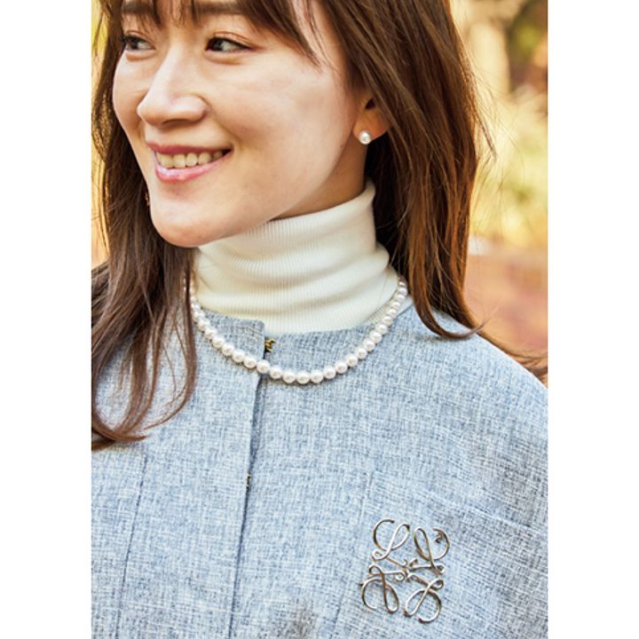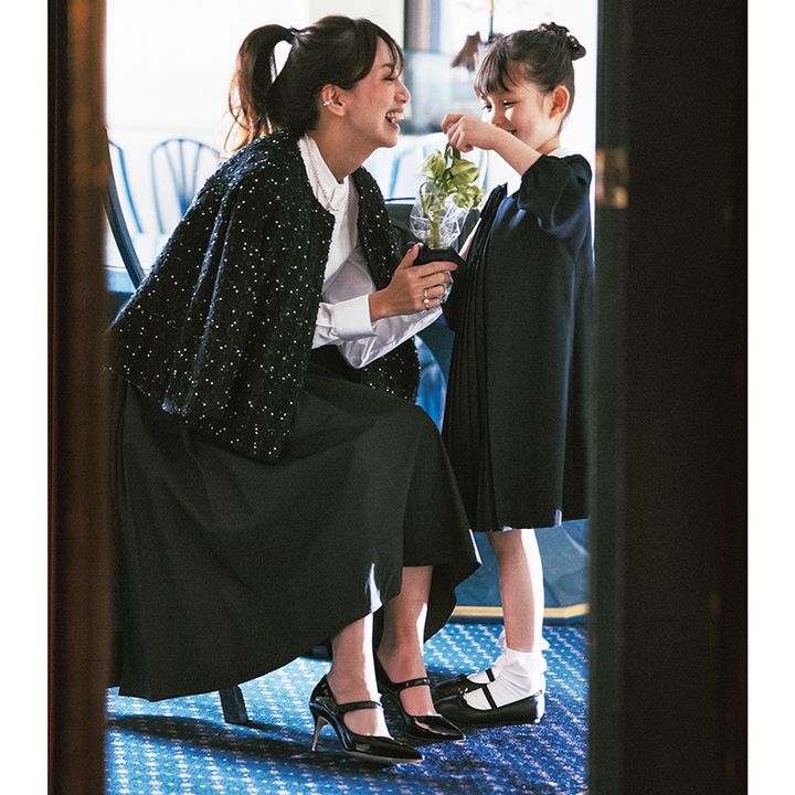 パンプス¥145,200(マノロブラニク/ブルーべル・ジャパン)ジャケット¥110,000(デパリエ/デパリエ ニュウマン新宿店)ブラウス¥52,800(セブリーヌ/トゥモローランド)スカート¥60,500(マディソンブルー)イヤーカフ¥321,200 リング¥855,800 ネックレス¥1,007,600(すべてTASAKI)【KIDS】ワンピース¥24,200(こどもビームス)シューズ¥4,400(グリーンレーベル リラクシング/ユナイテッドアローズ グリーンレーベルリラクシング 二子玉川ライズ店)その他/スタイリスト私物