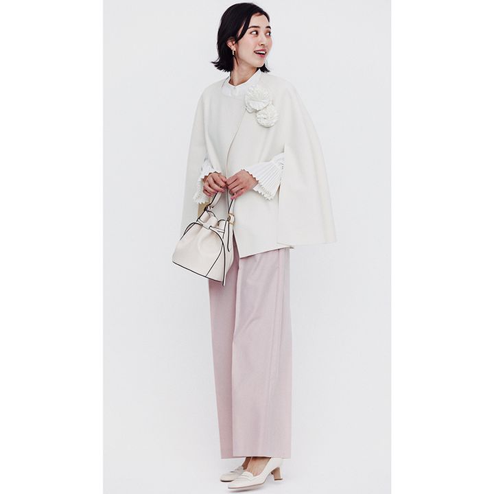 アウター¥78,000(コラム/エストネーション)パンツ¥26,400(セテンス)バッグ¥198,000(セルジオ ロッシ/セルジオ ロッシ カスタマーサービス)パンプス¥69,300(ペリーコ/アマン)ネックレス¥51,700(リエ スタジオ/トゥモローランド)ピアス¥5,500(セルフォード/セルフォード ルミネ新宿1店)