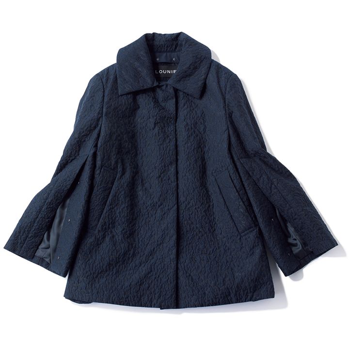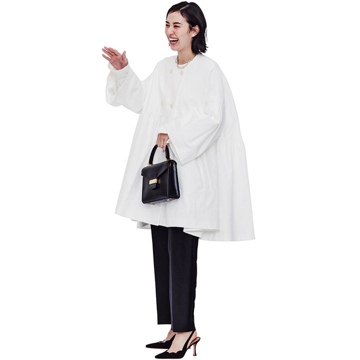 2023年、即完売となった幻のジャカードコートに白が登場。たっぷりとしたボリュームで、黒パンツコーデもドラマティックに。
