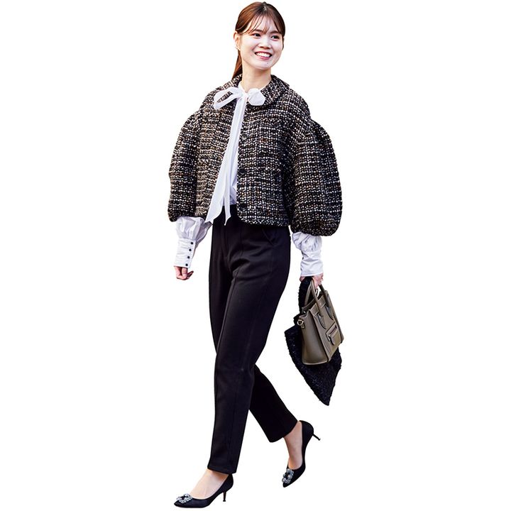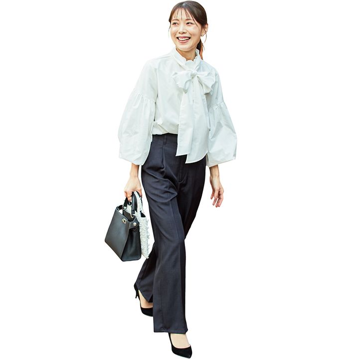 太パンツ×短丈の最旬バランスと 小さめボウタイで今年らしく