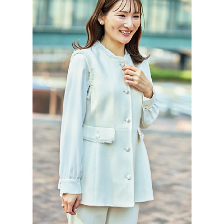 この春、長男の私立幼稚園入園と長女の公立小学校入学を予定。Wセレモニーで特別感を出したいからこそ、VERYで見て一目惚れしたジレが主役のオール白コーデで。ほどよいペプラムの微糖デザインが今の気分にぴったりです。