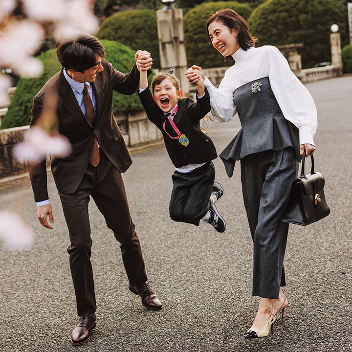 ビスチェ¥19,800 パンツ¥30,000(ともにシーニュ)ブラウス¥29,700 ブローチ¥22,000(ともにアドーア)バッグ¥1,174,800(デルヴォー)パンプス¥149,600(セルジオ ロッシ/セルジオ ロッシ カスタマーサービス)ピアス¥715,000(TASAKI)【KIDS】カーディガン¥5,500 ブラウス¥5,720 パンツ¥8,800(すべてグリーンレーベル リラクシング/ユナイテッドアローズ グリーンレーベルリラクシング 二子玉川ライズ店)その他/スタイリスト私物【MENS】ジャケット¥60,500 パンツ¥38,500〈ともにエストネーション〉シャツ¥44,000〈エリッコ フォルミコラ〉ネクタイ¥38,500〈アット ヴァン ヌッチ〉(すべてエストネーショングランフロント大阪店)靴/スタイリスト私物