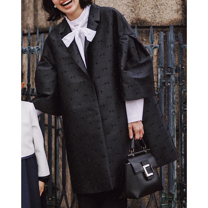 ハリのある素材に加えて、タック入りの袖やテントシルエットなど、どこを切り取っても盛り上がる一着。リボンドットのひとクセで黒も華やかに。ボウタイで顔まわりも明るく。