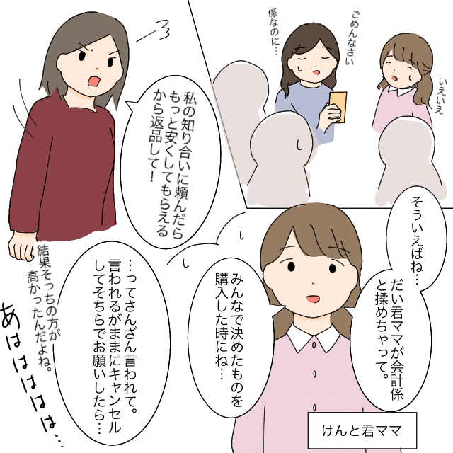 書記係のはるくんママが声を掛けてくれ相談したところ、自分では何もせず、変更ばかり繰り返す平上さんはPTAの役員さん達からも評判が悪かったと聞き「私だけじゃなかった!」とホッとしたひかるさん、そして、けんとくん、さくらちゃん、なつきちゃんママから手伝うよ!と言ってもらったと知り感謝するのでした・・。