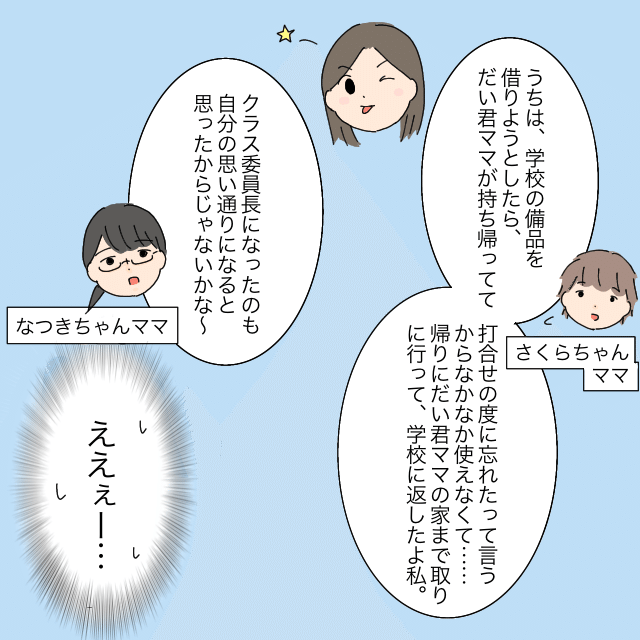 また、さくらちゃんママは、平上さんが学校の備品を借りたままなかなか返さないので、困って家まで取りに行ったという話。