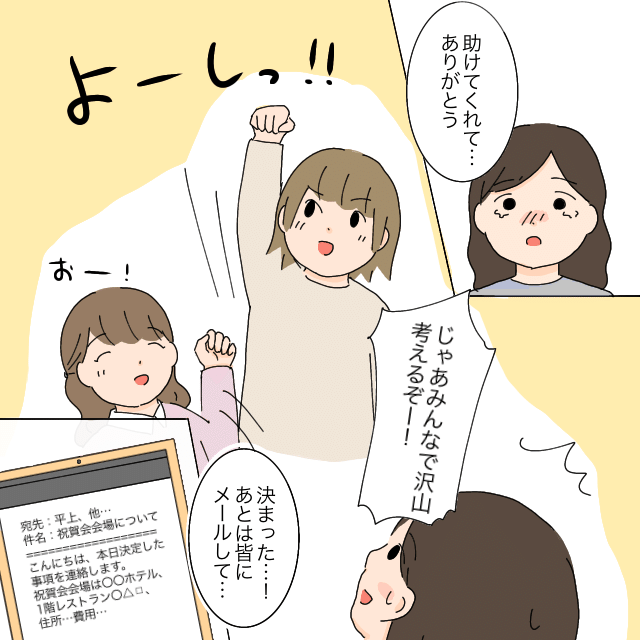 「祝賀会会場は既に手配済みなので、もし変更したい場合は平上さんがご自身でこのお店に連絡してキャンセルのうえ、新しい会場の手配までお願いします。こちらの進捗は他のPTA役員の方にも報告済みです。」と返信すると、それ以上は何も言ってきませんでした。