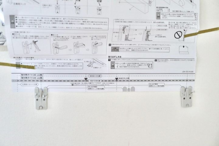 説明書が取り付ける際のガイド用紙になっているので、まずは取り付けたい場所にこの用紙を貼り付けてスタート!水平器があればベストです。