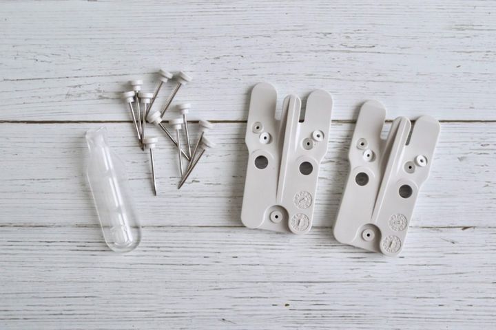 壁に直接取り付けるときに心配なのが、「穴問題」。フックのパーツを小さなピンで取り付けます(1つにつきピン5つ)。