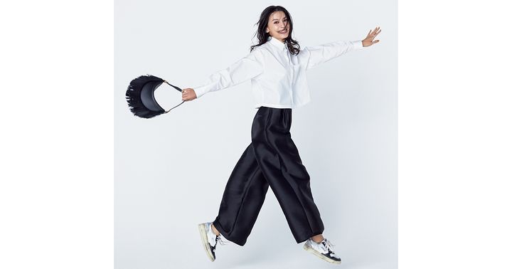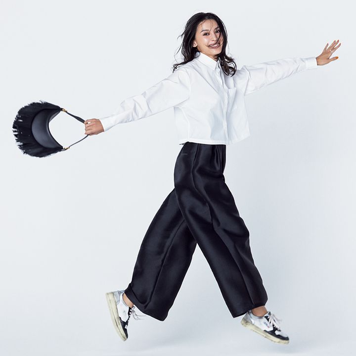 スニーカー¥48,400〈オートリー〉シャツ¥42,900〈アスペジ〉(ともにトヨダトレーディング プレスルーム)パンツ¥26,400(プランクプロジェクト/プランクプロジェクト 青山店)バッグ¥143,000(J&M デヴィッドソン/J&M デヴィッドソン カスタマーセンター)ピアス¥1,821,600 リング¥1,122,000※ともに予定価格(ともにブシュロン/ブシュロン クライアントサービス)