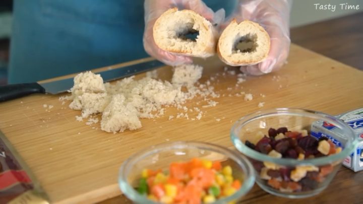 TastyTimeさんは、クラシックバスケットで具だくさんのサンドイッチを作っていました。包丁やめん棒でパンの中身を取り出し、フランスパンの真ん中を空洞に。中身は保存容器に入れておき、パン粉として別の料理に使います。