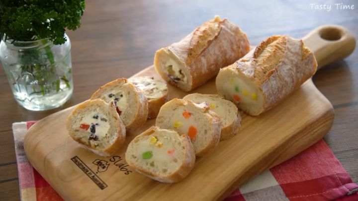 ポテトサラダとドライフルーツ&クリームチーズを隙間なくフランスパンに詰めてカットすれば、片手で食べられる具沢山のサンドイッチ、スタッフドバゲットの完成!