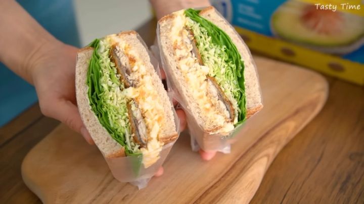 TastyTimeさんのおすすめアレンジはサンドイッチ!食パンにたっぷりの野菜とアジフライ、潰したゆで卵を重ねます。具だくさんのサンドイッチを作るときは、コストコで購入したプレスンシールを使うと失敗が少ないそう。最高においしいそうなので、アジフライを購入したらサンドイッチにも挑戦してみてください♪